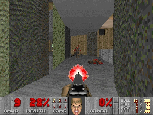From behind a small reception desk back in the room, Bitterman carefully squat and held his chaingun up from the floor. His eyes peeked above the desk. Doomguy was just about to head back up the stairs. Now's my chance to have some fun... Bitterman grinned before he jumped out and yelled "Eat lead!"