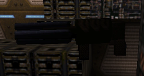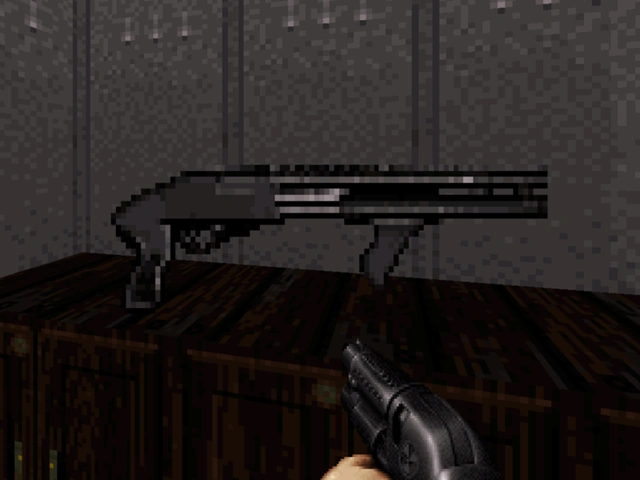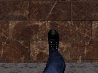 Bitterman caught his breath as he stopped to notice that he lost his opponent. Sighing with relief, Bitterman continued down the road at walking pace. Looking around, he noticed he was in a notorious area of town where the black market once reigned supreme. Even the criminals at this joint have deserted their goods. Peering in the windows, Bitterman began looking for items of use. Eventually stumbling on a munitions shop, Bitterman peered through the glass. To his delight, he found a set of brown cartridges labelled 'bullets' - just what he needed as his chaingun was almost out. Even more surprising was what was on the bottom shelf - grenades; but not just any old grenade... it was the green and red ones that he used back on Stroggos. Before Bitterman could fire his shotgun, he was cut off by a raspy threat and a big lumbering macho shadow coming from behind.