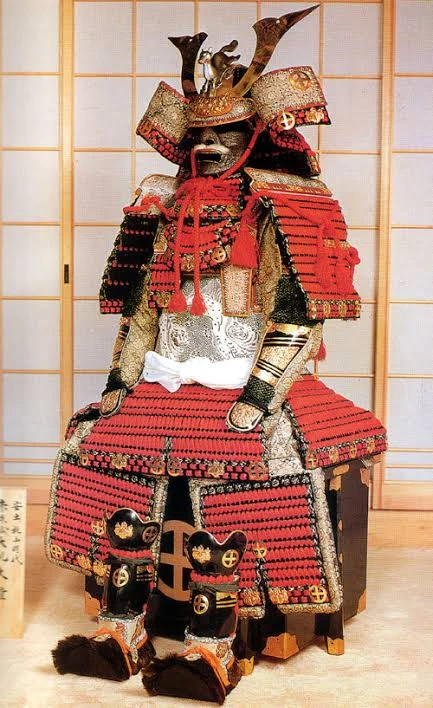 The O-Yoroi was the main form of Japanese armor during the Kamakura Jidai, and a piece of armor most often associated with the Samurai. Reserved to the mounted samurai class, it was made of leather and steel lamellae as well as silk. The steel and leather scales alternated, thus making the whole body covered in steel whiole also having a secondary defensive layer of leather scales. Furthermore, the defensive capacity of the O-Yoroi was enhanced by its unorthodox construction method: the lamellae were not laced together but rather laquered into a rigid plate, giving it many defensive properties reminiscent of solid cuirass armor. The pauldrons known as O-Sode could be used as shields to block incoming projectiles as they were very durable and were often used to block arrows. Alongside the O-Yoroi, the Kabuto helm and many kogusoku auxiliary armors such as sune-ate greaves, menpo face guard and kote arm guards were donned and under the armor was worn the Yoroi-Hitatare, a thick silk robe which acted as padding. It weighed around 26kg, but because a lot of the weight was applied on the shoulders, it was less effective and felt heavier on foot than on horseback.