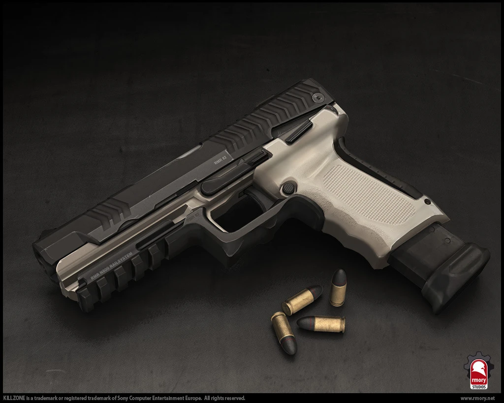 The LS12 is the standard-issue semiautomatic VSA pistol. It fires bullets, and has a silvery blue dot-laser sight.