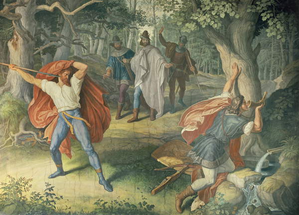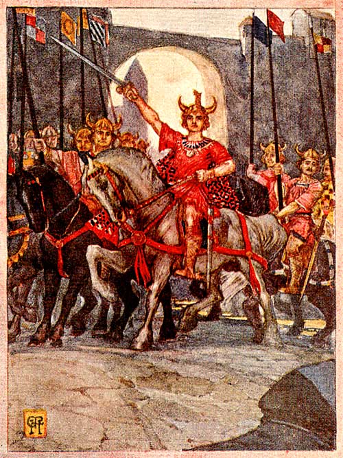![]() Siegfried is the child of Siegmund and Sieglinde, a pair of twins who ruled Xanten, a city in the Netherlands. Refusing to take the throne while his parents were still alive, he set out to journey and prove himself as a knight. He set out to woo Kriemhild, the fairest woman in the land, over the objections of his parents, who believed her brother, Gunther, to be treacherous. Along his adventures, he slew the dragon Fafnir and bathed in its blood, making his skin impenetrable save for a linden leaf-shaped spot on his back. He eventually made his way to Worms, where he entered the court of Gunther as an equal. After his service in the wars against Saxony, Gunther continued to string Siegfried along, keeping him at his court but refusing to let him meet Kriemhild, until a feast, where he allowed him in her company to bind Siegfried to his service. Gunther continued to dangle the prise of Kriemhild in front of Siegfried, before finally consenting to the marriage should Siegfried help him woo Brunhild. Siegfried does so, assisting Gunther in cheating using his invisibility cloak. After successfully overpowering Brunhild, Siegfried pridefully steals Brunhild's ring and belt, which are traditional symbols of chastity. After returning to the Netherlands, he gifts his own wife these objects. Upon returning to Worms at Gunther's invitation, Brunhild snubbed Kriemhild, and the latter displayed openly the belt and ring which Siegfried took from her. While Siegfried publicly refuted his wife's claim that he took Brunhild's chastity, the Queen of Worms was nevertheless incensed against him. Hagen, Kriemhild's friend and Gunther's closest advisor, then hatched a plan to kill Siegfried and steal his wealth. Hagen tricked Kriemhild into telling him about Siegfried's weakness, the leaf-shaped patch between his shoulder blades where he can be killed. She marked it on his tunic, thinking she was showing her friend where to protect her husband. Then, during a hunt, Gunther, Hagen, and their followers killed Siegfried while he was getting a drink, taking great care to separate him from his weapons and armor. Once news of this reached his wife, Kriemhild fell into despair, before being married off to Etzel, whose court she used to exact revenge on her kin.