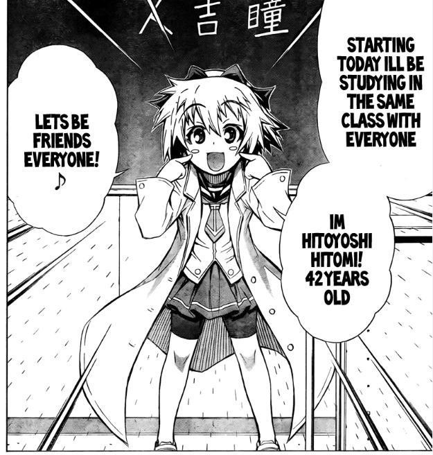 ![]() Hitomi Hitoyoshi is the mother of Zenkichi Hitoyoshi, one of the main characters in Medaka Box. Her unnamed (and likely lolicon) husband married her because he was attracted to her excellence as one of the foremost psychosomatic surgeons, but later left after their child was born because he couldn't handle how superior she was. She eventually left her job to raise her son as a single mother, utilizing her Abnormality to its fullest extent. She appears in the story after Kumagawa is introduced, using her stature and signature red bag to pretend she's an elementary-schooler to prank her son's friends. She then transfers into Zenkichi's class, doing her best to embarrass him as much as humanly possible. She later saves him from Emuake Muake, and assists him in fighting off Kumagawa's attempted hostile takeover of the school. She then fades out of the story, only popping up to help Zenkichi train, give him a pep talk, or repair the mental damage Iihiko did to Kumagawa and Zenkichi.