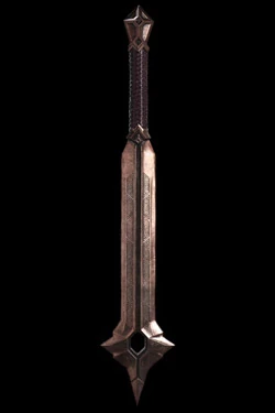 Orcrist is an elvish blade forged in Gondolin that Thorin found in the troll's horde. The weapon, also known as the "Goblin Cleaver", or "Biter" amongst orcs, was a legendary blade known to slain many an orc. The blade is possesses the usual high-quality and durability of elvish steel. The blade will also glow blue if orcs are nearby. Morphologically, Orcrist is a single-edged sword similar to a real-world falchion, designed primarily for hacking and chopping, but also possessing a point capable of thrusting.