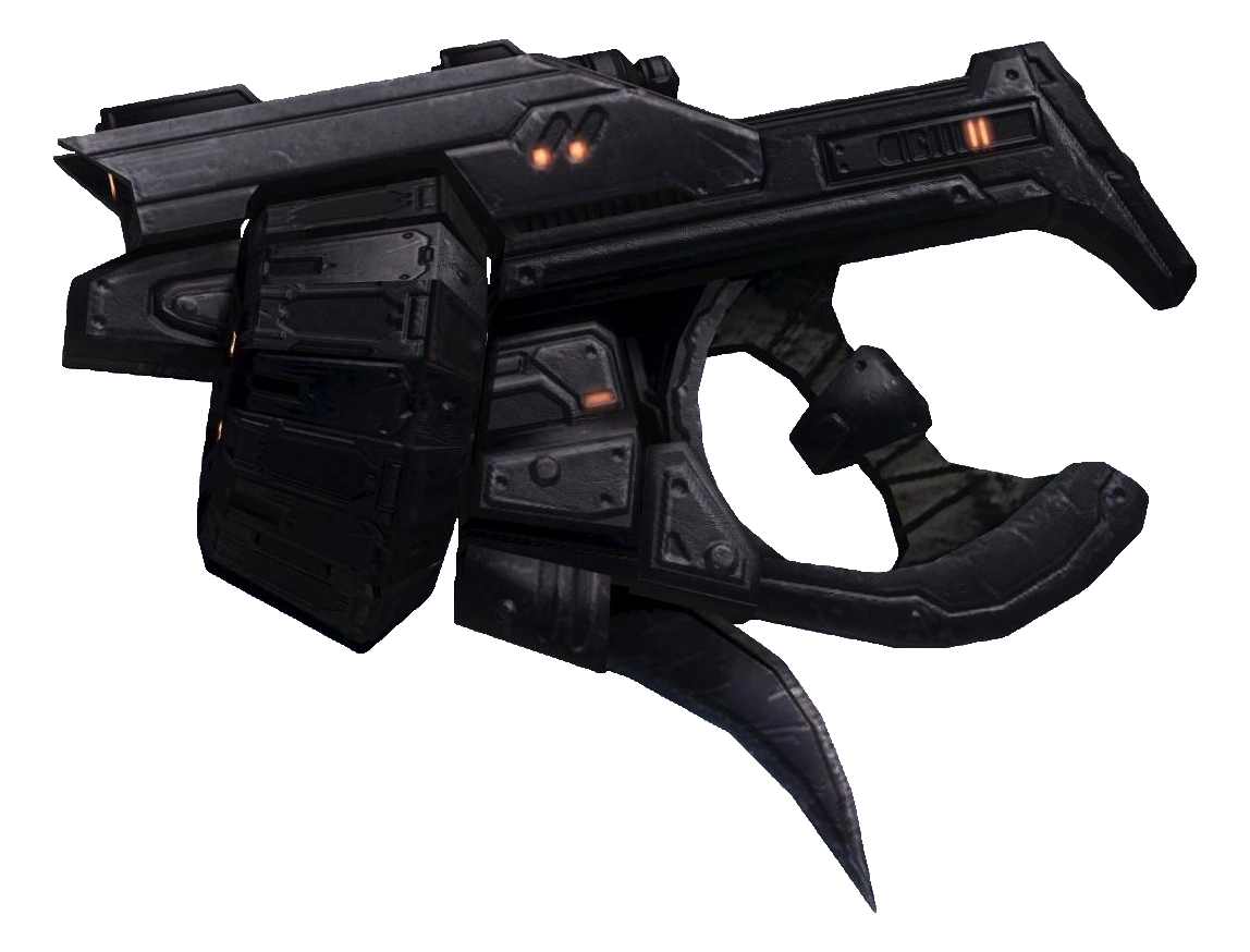 The Type 52 is a weapon classed as a pistol by the Covenant, but is considered by humans to be more of a light shotgun. The weapon is a semi-automatic shotgun fed with a revolver-style drum magazine. The weapon has a short range, probably 50 meters or less, but while not as powerful as the larger human-made M90, still packs a destructive punch against most targets. The weapon has a blade attached to the bottom for use as a melee weapon, attacking in a downwards strike with the blade.
