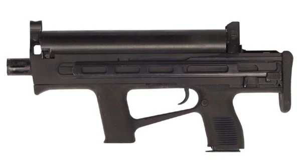 The Calico M950 is a 9mm submachine gun with a 100 round helical drum magazine. The weapon has a range of about 100 meters and a rate of fire of 745 rounds per minute.