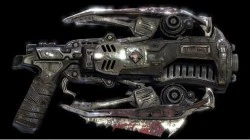 The Gorgon is an unusual twin-barreled pistol with a 32-round magazine capable of firing in eight round bursts, or is fully automatic. The weapon also has a hydraulic spike attacked for use in close combat.