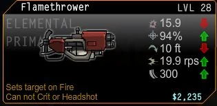 Exclusive only for Tower. It sets enemy on fire It does have lower damage than other elemental weapons Tower has. But effectively has a high fire rate and ammunition plus great burning effect that can spread. But Tower can be burned himself if gets close to the flame. The weakness is that it has low range and unreloadable.