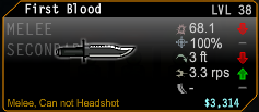 The First Blood is a combat knife for Tower. It is a short knife and fast to swing. It can tear through enemies like a butter if used properly. It has a really short range and requires Tower to be very close to the user. Depends on the user's reach. It is deadly in experienced hands and sometimes can bleed an enemy.
